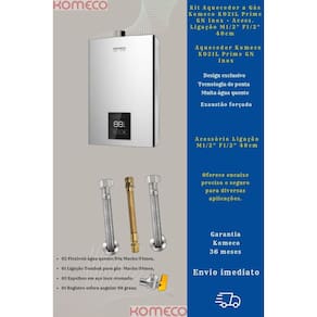 1 Kit Aquecedor KO21PRIME 21L GN + Acess. Ligação De Aquecedor A Gás Komeco M1/2" F1/2" 40cm (02 Flexíveis de 40cm para água quente ou fria (1/2 pol. Macho / Fêmea), 01 Ligação Tomback de 40cm (1/2 pol. Macho / Fêmea) para gás, 03 Espelhos em aço inox cromado e 01 Registro esfera angular em L )