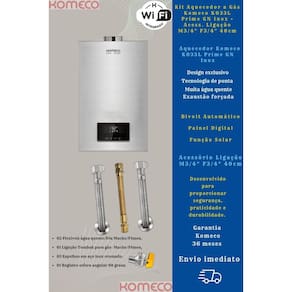 1  Kit Aquecedor Komeco KO33DIPRIME 33L GN Inox + Acess. Ligação De Aquecedor A Gás Komeco M3/4" F3/4" 40cm (02 Flexíveis de 40cm para água quente ou fria (3/4 pol. Macho/ Fêmea), 01 Ligação Tomback de 40cm (3/4 pol. Macho /Fêmea) para gás, 03 Espelhos em aço inox cromado e 01 Registro esfera angular em L)