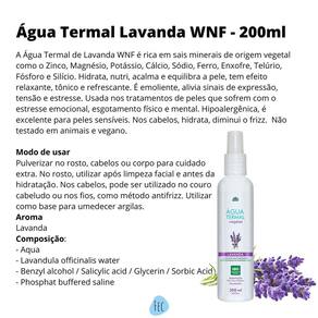 A Água Termal de Lavanda da WNF é rica em minerais, como potássio, que estimula a renovação e estrutura das células, cálcio, magnésio, que estimula a formação de colágeno, e silício, que prepara a pele para a permeação de princípios ativos diversos. Sua extração é feita durante a destilação dos óleos essenciais.