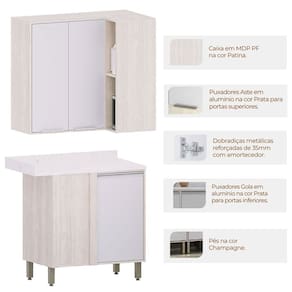 • Pintura: Armário: 4 Prateleiras Internas/Dobradiças Metálicas 35 mm com Amortecimento/2 Puxadores Aba em Alumínio Prata (Anodizado); Balcão: Estrutura e Prateleira em Patina FF/1 Prateleira Interna/1 Puxador Gola em Alumínio Prata (Anodizado)/Dobradiças Metálicas 35 mm com Amortecimento/Pés na Cor Champanhe;