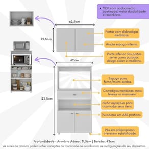 Dimensões do produto montado: Armário Aéreo - Altura: 39,5cm | Largura: 62,5cm | Profundidade: 31,5cm Balcão - Altura: 122,5cm | Largura: 62cm | Profundidade: 42cm *Você pode consultar as medidas detalhadas na imagem técnica do produto.