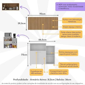 Dimensões do produto montado: Armário Aéreo - Altura: 39,5cm | Largura: 93cm | Profundidade: 31,5cm Balcão - Altura: 75cm | Largura: 86,5cm | Profundidade: 36cm *Você pode consultar as medidas detalhadas na imagem técnica do produto.