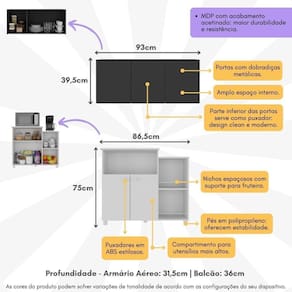 Dimensões do produto montado: Armário Aéreo - Altura: 39,5cm | Largura: 93cm | Profundidade: 31,5cm Balcão - Altura: 75cm | Largura: 86,5cm | Profundidade: 36cm *Você pode consultar as medidas detalhadas na imagem técnica do produto.