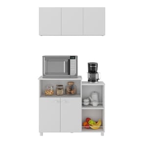 O balcão possui 2 portas com puxadores em ABS, nicho e fruteiras, proporcionando uma melhor organização dos mantimentos. Conta com espaço para micro-ondas (até 10kg) e galão d'água (até 20kg), que oferece praticidade e otimização do espaço na sua cozinha. Os pés em polipropileno garantem estabilidade ao móvel, enquanto as varetas em aço pintado epóxi oferecem para que os itens acomodados nos nichos não caiam, tornando este produto uma escolha para o seu ambiente doméstico.