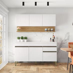 O Armário de Cozinha Completa Line possui design versátil e multifuncional, perfeito para sua cozinha ou área gourmet! Composto por um armário aéreo com três portas que se abrem de forma inovadora, graças a um sistema avançado de abertura. A porta, maior que a estrutura do armário, se estende sobre a base, permitindo a abertura sem a necessidade de puxadores. Acompanha balcão com três portas e prateleiras internas, oferecendo um espaço amplo e personalizável para armazenar itens de forma eficiente. A gaveta com corrediça 100% telescópica é um destaque, permitindo uma abertura ampla e um deslizamento suave, facilitando o acesso aos itens armazenados. Além disso, os pés reguláveis garantem estabilidade e ajuste perfeito ao piso.