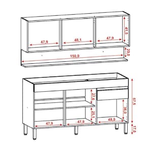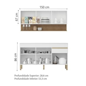 Certifique-se de tudo antes de finalizar a compra, evitando assim futuros desagrados ou imprevistos com a entrega. MEDIDAS ARMÁRIO AEREO:: [ A ] = 67 cm [ L ] = 150 cm [ P ] = 28,6 cm | MEDIDAS BALCÃO:: [ A ] = 86 cm [ L ] = 150 cm [ P ] = 53,3 cm | PESO:: 74 kg | PESO SUPORTADO:: 20kg (Armário Aéreo) 55 kg (Balcão) | PRATELEIRAS SUPORTAM:: 10 kg | NICHO SUPORTA ATÉ:: 5 kg | GAVETA SUPORTA ATÉ:: 10 kg | TAMPO SUPORTA ATÉ:: 15 kg | MODELO:: Armário de cozinha completa 6 Portas 1 Gaveta 1,50m Line | MARCA:: Kit's Paraná | COR:: Branco / Madeirado | MATERIAL DA ESTRUTURA:: MDP | ACABAMENTO:: Acabamento em pintura com secagem em luzes UV | DOBRADIÇAS:: Metálicas | GAVETAS:: 1 | CORREDIÇAS:: Telescópicas | NICHOS:: 1 | ESPESSURA DO MATERIAL:: 15 mm | PORTAS:: 6 | TIPO DE PORTA:: Bater | PRATELEIRAS:: 2 | PÉS:: 5 | TIPO DE PÉS:: Reguláveis | MATERIAL DOS PÉS:: Plástico | RECOMENDAÇÕES DE LIMPEZA:: A limpeza do móvel de ser efetuada somente pano macio e moderadamente umedecido com água pura ou solução com sabão neutro. Evitar mover o produto com utensílios dentro do mesmo. | MATERIAL DOS PUXADORES:: Alumínio | QUANTIDADE DE PUXADORES:: 4 | DIFERENCIAL:: Armário aéreo com sistema avançado de abertura, sendo possível a abertura sem puxador, corrediças telescópicas e pés reguláveis | GARANTIA:: 3 Meses | ITENS INCLUSOS:: 1 Balcão de Cozinha, 1 armário aéreo, 1 Manual de Montagem, 1 Kit Parafusos | AVISO:: A Esplanada Móveis se responsabiliza pela entrega dos produtos adquiridos até a porta de entrada ou portaria do endereço indicado, se a portaria do condomínio permitir, as entregas são efetuadas no piso térreo e é de responsabilidade do cliente. | TIPO DE MÓVEIS DE COZINHA:: ARMÁRIO | REQUER MONTAGEM: SIM | MATERIAIS DO CORPO:: MDP Cor: Madeir/Bra