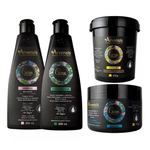 Kit arvensis cachos sh + cond + masc 2x1 + masc onduladoNeste anúncio contém:1 unidade shampoo cachos arvensis 300ml1 unidade condicionador cachos arvensis 300ml1 unidade máscara ondulados e cacheados arvensis 250g1 unidade máscara 2x1 cachos naturais arvenis 450gShampoo cachos arvensisO shampoo cachos naturais foi desenvolvido com uma formulação livre de sulfato e sal, especial para a limpeza suave de todos os tipos de cabelos cacheados. Elaborado através da perfeita combinação de óleo de coco, colágeno vegetal e vitamina e, o shampoo cachos naturais proporciona inúmeros benefícios como reparação dos fios danificados, aumento da elasticidade, maciez e brilho extra. Sua ação protetora ainda confere resistência, formação de filme e controle de frizz, além de manter a umidade natural para cachos nutridos e radiantes.Principais ativos:- óleo de coco: alto poder umectante e hidratante, repõe nutrientes e age na diminuição do frizz. Ainda tem ação de selamento de cutículas evitando pontas duplas.- colágeno vegetal: fornece aminoácidos e proteínas para nutrição funcional da fibra, promove hidratação e restaura a elasticidade dos fios. Forma um filme flexível ultra substantivo que protege e define os cachos, além de atuar no controle do frizz.- ph 5-6Indicação: todos os cachos.Condicionador cachos arvensisO condicionador cachos naturais foi desenvolvido com uma formulação especial, ideal para a hidratação de todos os tipos de cabelos cacheados. Elaborado através da perfeita combinação de óleo de coco, colágeno vegetal e vitamina e, o condicionador cachos naturais proporciona inúmeros benefícios como nutrição avançada, reparação dos fios danificados, condicionamento equilibrado, aumento da elasticidade, maciez e brilho extra. Sua ação protetora ainda confere resistência e controle de frizz, além de manter a umidade natural para cachos nutridos e radiantes.Principais ativos:- óleo de coco: alto poder umectante e hidratante, repõe nutrientes e age na diminuição do frizz. Ainda tem ação de selamento de cutículas evitando pontas duplas.- colágeno vegetal: fornece aminoácidos e proteínas para nutrição funcional da fibra, promove hidratação e restaura a elasticidade dos fios. Forma um filme flexível ultra substantivo que protege e define os cachos, além de atuar no controle do frizz.- ph: 4-4,5Indicação: todos os cachos.Máscara ondulados e cacheados arvensisA máscara ondulados e cacheados promove hidratação equilibrada com ação intensiva proporcionando inúmeros benefícios como nutrição avançada, reparação dos fios danificados, maciez e brilho extra. 250g - ph 3,5 - 4,5Indicação: cabelos ondulados e cacheados 2a / 2b / 2c / 3a .Principais ativos: óleo de coco; colágeno vegetal.Máscara cachos naturais 2x1 arvensisA máscara cachos naturais 2x1 foi desenvolvida para atuar como hidratante e finalizador para cabelos crespos e crespíssimos. Elaborado através da perfeita combinação de óleo de coco, colágeno vegetal, abacate e vitamina e, a máscara proporciona inúmeros benefícios como nutrição avançada, reparação dos fios danificados, alta hidratação, maciez e brilho extra.Sua ação protetora e multifuncional - enriquecida com filtro solar - ainda confere resistência, formação de filme e controle de frizz, além de manter a umidade natural para cachos nutridos e radiantes. Ideal para ser utilizada na técnica sem shampoo.Principais ativos:- óleo de coco: alto poder umectante e hidratante, repõe nutrientes e age na diminuição do frizz. Ainda tem ação de selamento de cutículas evitando pontas duplas.- colágeno vegetal: fornece aminoácidos e proteínas para nutrição funcional da fibra, promove hidratação e restaura a elasticidade dos fios. Forma um filme flexível ultra-substantivo que protege e define os cachos, além de atuar no controle do frizz.-abacate: o extrato natural de abacate possui propriedades emolientes que promovem hidratação profunda, nutrição e vitalidade aos cabelos.