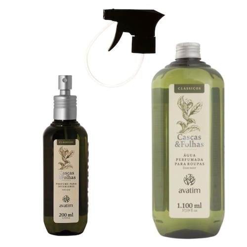 O kit contém: 1 Água Perfumada para Roupas Cascas e Folhas 1100ml 1 Válvula dispersora 1 Perfume para interiores Cascas e Folhas 200ml