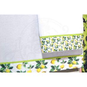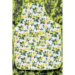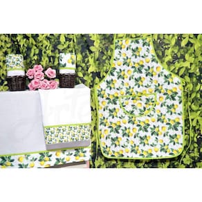Avental fabricado em tecido matelado e estampado na parte da frente e plástico leitoso na parte de trás, com estampa de limão siciliano, em tons de amarelo, branco e verde, com bolso frontal e acabamento em viés na cor verde , pano de prato na cor branco com barrado matelado com estampas de limão siciliano e detalhes em viés na cor verde.