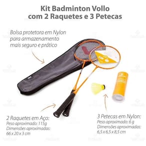 Prático e completo, o Kit Badminton da Vollo conta com a combinação de duas resistentes raquetes de aço, três petecas de nylon (material leve e resistente) e uma bolsa de transparência frontal para armazenamento. Garanta já o seu Kit e desenvolva suas melhores habilidades!