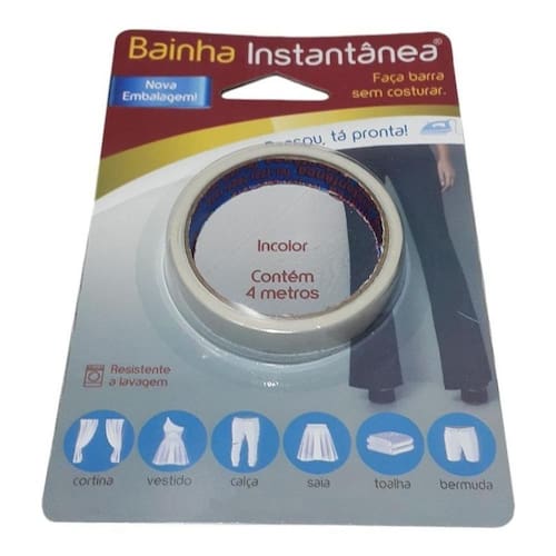 Kit Bainha Mágica instantânea em forma de fita termocolante. Faça a bainha de roupas sem costurar. Dispensa linha e agulha, não solta ao lavar. Pode ser utilizado em cortinas, vestidos, calças, saias, bermudas etc. Aplicável com ferro quente. Desenvolvido para tecidos de algodão, aplicável a outros tecidos com bons resultados. 4 m de comprimento x 1 cm de largura. O valor anunciado é para 10 unidades.