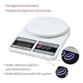 Precisão nas medições – de 1 g a 10 kg; Compacta, funciona sem estar na tomada; Funciona por 2 pilhas AA 1.5V; Display LCD com botão Liga/Desliga; Desligamento automático; Botão MODO para medir OZ e grama.