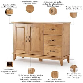 Máxima organização para sala de jantar. Este conjunto potente associa o Balcão Buffet 120cm, de grande capacidade com 3 gavetas e 2 portas a um Aparador Rústico funcional de 2 gavetas. Armazene tudo, de talheres a jogos de jantar, mantendo a estética rústica e coesa da Linha Lira. Além disso, surpreenda-se com a robustez da madeira maciça e com os detalhes em tonalidade ouro envelhecido, que criam uma atmosfera de requinte campestre. Enfim, móveis rústicos para sala de jantar com beleza robusta que abriga suas histórias. Adquira já o seu!