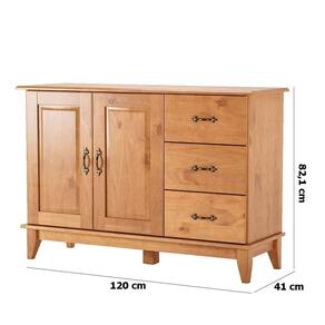 Característica do Buffet Aparador 100% Madeira Maciça 2 Portas: - Estrutura 100% madeira de pinus de reflorestamento; - 2 portas com dobradiças de pressão; - 3 gavetas com corrediça telescópica; - Pés com sapatas; - Acabamento com verniz fosco;