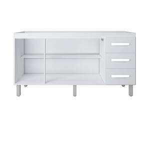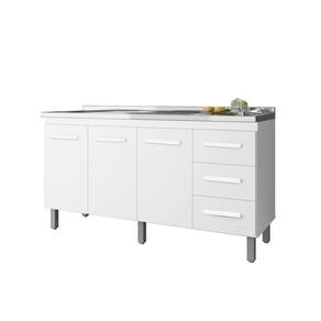 Detalhes do balcão de pia: - Largura: 138 cm (serve para pias de até 160 cm) - Altura com pés: 83,5 cm / sem pés: 69 cm - Profundidade: 50 cm - Estrutura em MDP - Corrediças metálicas nas gavetas - Puxadores cromados - Pés reguláveis de plástico (até 18 cm) - Não acompanha tampo