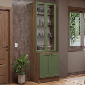 O acabamento de alta resistência da estrutura é em tom amadeirado Rustic, das frentes em Verde e possui uma textura suave ao toque. O destaque fica por conta do detalhe chanfrado das frentes, que forma molduras elegantes e dá profundidade ao design, refletindo o estilo americano com um toque moderno. Outro diferencial está nos puxadores ponto em ouro envelhecido, feitos com metal resistente, trazem personalidade e um charme único.