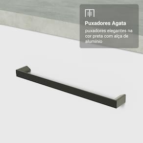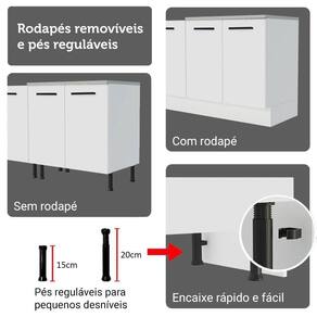 O móvel se destaca pelos detalhes de qualidade, como puxadores com alça em alumínio no balcão, portas com amortecimento para um fechamento suave e pés reguláveis em PVC.