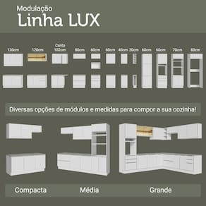 Este conjunto ainda pode ser complementado com outros módulos da linha Lux da Madesa. Para completar, o acabamento nos tons amadeirado Rustic e branco garante um visual sofisticado ao ambiente.