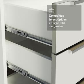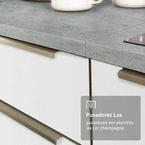 Composto por itens de qualidade, possui puxadores em alumínio no balcão, portas com amortecimento para um fechamento suave e pés reguláveis em PVC.