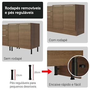 Destaque para a qualidade em cada detalhe, como puxadores slim em alumínio no balcão, portas com amortecimento para um fechamento suave e pés reguláveis em PVC.