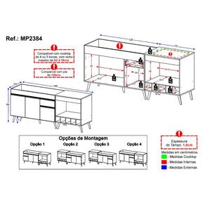 - Tampo em MDP 15mm com pintura de alta resistência, compatível com Cooktop de 4 ou 5 bocas. O recorte do tampo deve ser feito no momento da montagem, conforme o tamanho do seu Cooktop (tamanho máximo do nicho: 62 x 36cm).