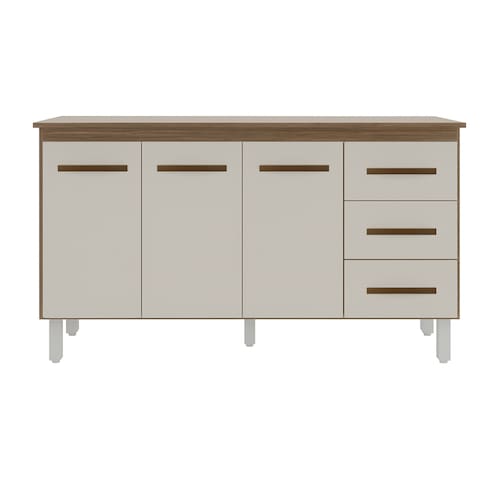 Composto por 2 portas, 3 gavetas e 1 prateleira interna, proporciona excelente espaço de armazenamento para utensílios, panelas e mantimentos. Os 5 pés plásticos com regulagem garantem estabilidade e permitem ajustes para nivelamento, com altura de 16,5 cm que pode chegar até 18 cm.