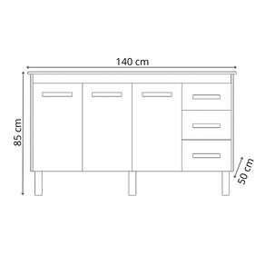 O Balcão possui 83,5 cm de altura com os pés e 67 cm sem os pés, 138 cm de largura e 50 cm de profundidade, sendo ideal para ambientes de diferentes tamanhos.