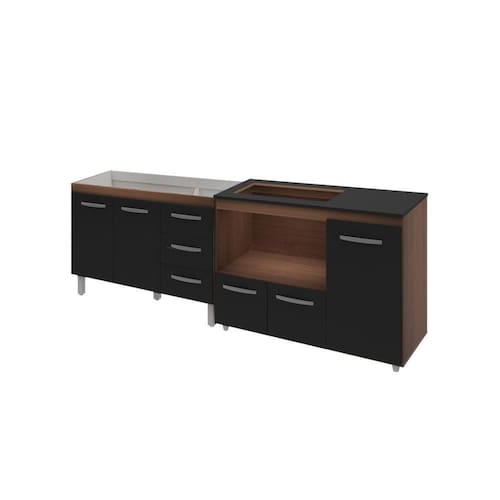 Kit Balcão Para Pia 118 Cm Bianca Savana Frente Preto Com Balcão Para Cooktop 5 Bocas Ana Savana Frente Preto O Kit Balcão para Pia 118 cm Bianca com Balcão para Cooktop Ana oferece uma solução completa e sofisticada para a sua cozinha. Combinando estilo contemporâneo com funcionalidade excepcional, este conjunto é perfeito para quem busca praticidade, organização e beleza no ambiente culinário. Características Balcão de Pia Bianca 118 cm: Altura:83,5 cm (Com os Pés). Altura sem os pés: 69 cm. Largura: 118 cm (Padrão para pia de 120 cm). Profundidade: 50 cm. Material: MDP (madeira). Portas: 2 Portas. Gavetas: 3 Gaveta. Prateleiras: 1 Prateleira. Puxadores: 5 puxadores plásticos cromados Pés: 5 pés reguláveis de plástico. Altura dos pés: 16,5 cm Regulagem dos pés: Somente para nivelamento, (Chega no máximo a 18 cm). Corrediças: Metálicas. Acompanha tampo: Não Indicações de Uso: Cozinha