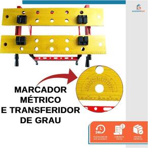 - Bancada portátil de trabalho e ferramentas; - Com barra transversal onde pode ser utilizado como porta ferramentas; - Ideal para trabalhos como lixar, pintar, apoiar, prensar, servir de suporte, entre outros; - Bancada de trabalho ajustável portátil dobrável em alumínio com tampo de madeira; - Presilhas ajustáveis e régua; - Com manivelas para ajuste do tampo de madeira. - Possui 4 mordentes ajustáveis manualmente para fixação.