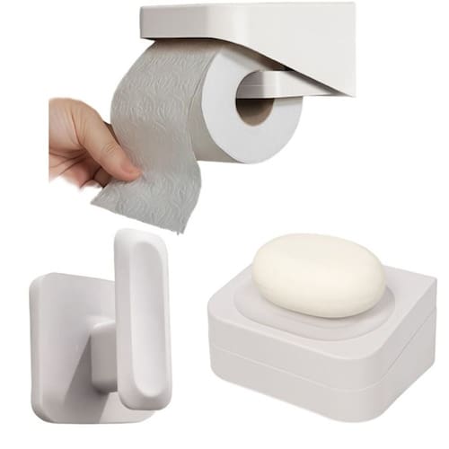 Kit Saboneteira + Suporte Papel Higiênico + Gancho Multiuso de Parede Com Adesivo Bege