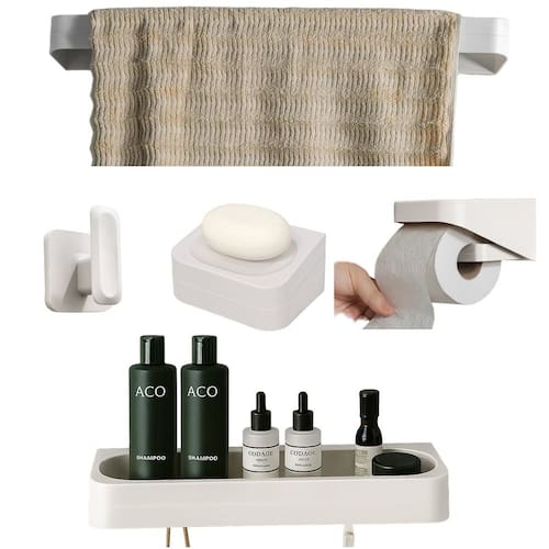 Kit Saboneteira + Suporte Papel Higiênico + Prateleira Porta Shampoo + Gancho Multiuso de Parede Com Adesivo Bege