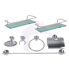 Contém na caixa: 02 porta shampoo vidro temperado 01 un porta toalha reto 01 un porta toalha redondo 01 un saboneteira aço inox 01 un papeleira com tampa 01 un cabide duplo