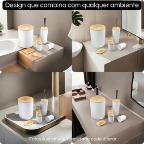 1 Porta escova de dentes; 1 Lixeira com tampa vazada; 1 Porta sabonete líquido 300ml ; 1 Saboneteira; 1 Copo multiuso; 1 Escova sanitária.