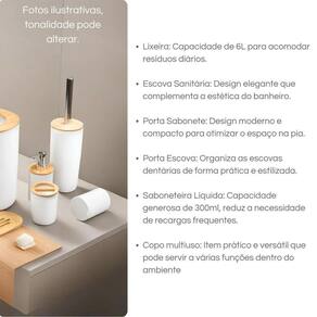 O Kit de Banheiro de 6 Peças Nápoles oferece uma solução completa e funcional para aprimorar sua experiência diária de cuidados pessoais. Com uma lixeira prática, escova sanitária eficiente, saboneteira líquida de fácil uso, porta sabonete conveniente, copo multiuso e porta escova, este conjunto é projetado para simplificar sua rotina de higiene. Além de proporcionar organização, a combinação de plástico durável e madeira de bambu confere um design elegante ao seu banheiro. Experimente a praticidade de ter todos os acessórios essenciais em um só conjunto, proporcionando um ambiente de banho mais eficiente e esteticamente agradável. Transforme seu banheiro em um espaço funcional e sofisticado com este kit completo e versátil.