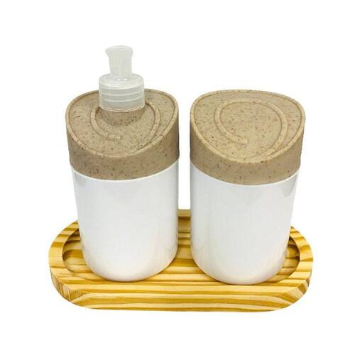 Kit Banheiro de madeira c/ 2 Peças O material é resitente, antibacteriano, sustentável, orgânico e natural, para quem busca por produtos sustentáveis, modernos e elegantes. Acompanha: - 1 Dispenser de Sabonete Líquido - 1 Porta algodão/cotonete Material Utilizado: - Potes e tampas: Plástico - Bandeja: Madeira Medidas: - Sabonete Líquido:12x21 cm - Porta Algodão/Cotonete: 8x13 cm Ean: 7898901266372