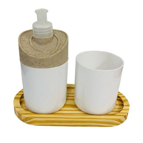 Kit Banheiro de madeira c/ 2 Peças O material é resitente, antibacteriano, sustentável, orgânico e natural, para quem busca por produtos sustentáveis, modernos e elegantes. Acompanha: - 1 Dispenser de Sabonete Líquido - 1 Porta algodão/cotonete Material Utilizado: - Potes e tampas: Plástico - Bandeja: Madeira Medidas: - Sabonete Líquido:12x21 cm - Porta Escovas: 8 cm Ean: 7898901265542