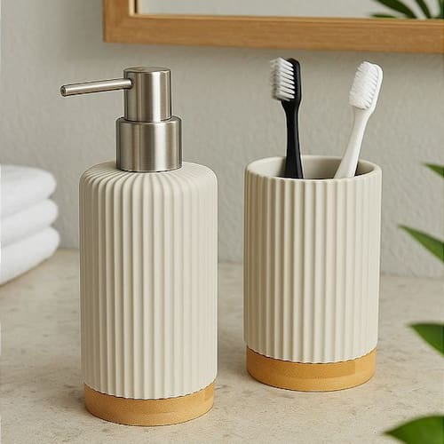 Kit Banheiro em Poliresina com Bambu – Porta Sabonete 250ml + Copo (Bege) Transforme a organização do seu banheiro com um toque de sofisticação natural. O Kit de Banheiro em Poliresina com Bambu, na elegante cor bege, combina funcionalidade, durabilidade e design contemporâneo, sendo ideal para lavabos e banheiros que valorizam estética e praticidade. Produzido em poliresina de alta qualidade, o kit oferece excelente resistência à umidade e acabamento refinado. Os detalhes em bambu natural acrescentam charme e aconchego, criando uma composição harmoniosa que combina com diferentes estilos de decoração, do moderno ao natural. O conjunto é composto por: