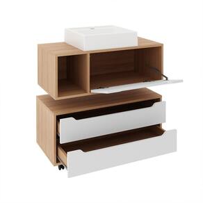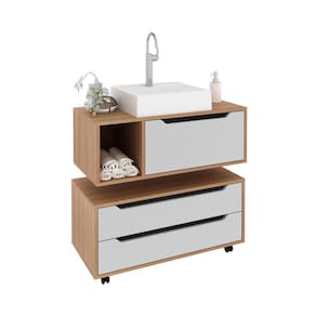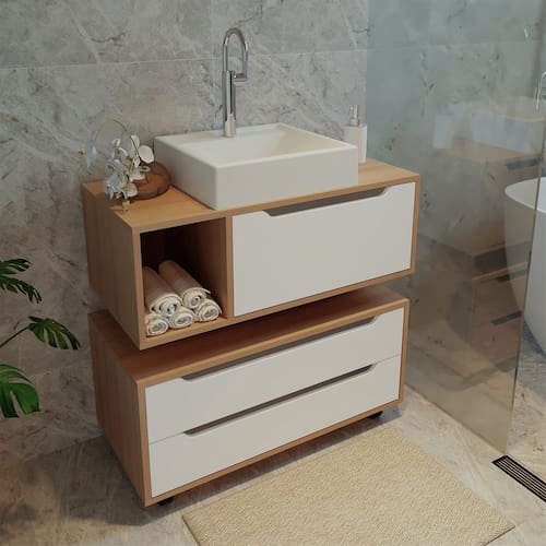 O Kit para Banheiro é a escolha ideal para dar um toque de elegância e organização ao seu espaço. Com um design contemporâneo, ele transforma o ambiente em um local mais convidativo e prático. Fabricado com materiais de alta qualidade, o kit oferece durabilidade e um visual sofisticado, tornando seu banheiro ainda mais funcional e bonito. CARACTERÍSTICAS TÉCNICAS: - Produzida em MDP de 15 mm - Acabamento UV na cor Amêndoa e Branco - Cuba em Mármore Sintético - Gaveteiro com Corrediças Metálicas e Rodízios - Porta Basculante com Articulador e Dobradiças Metálicas - Puxador tipo Cava - Balcão Suspenso *Kit Composto por Gabinete Suspenso (3644), Gaveteiro (3643) e Cuba (3630) INFORMAÇÕES TÉCNICAS: 3643: Alt. 38,8 cm x Larg. 80 cm x Prof. 38,7 Cm x P. 15,4 kg 3644: Alt. 38,8 cm x Larg. 80 cm x Prof. 38,7 cm x P. 11,2 kg 3600: Altura: 10 cm x Larg. 40 cm x Prof. 38 cm x P. 5 kg INFORMAÇÕES ADICIONAIS: - ATENÇÃO: Não trabalhamos e não nos responsabilizamos pela montagem do móvel. Antes da montagem conferir se o produto está de acordo com o que comprou, produto montado e danificado pela montagem não será aceito troca. Montagem e instalação por conta do comprador. - As imagens ambientadas são meramente ilustrativas e podem apresentar itens que não compõe o produto. As cores do produto podem variar de acordo com o monitor, a iluminação do ambiente ou sua percepção visual. - Limpeza: Deve ser feita com pano macio e seco ou levemente umedecido com água e sabão neutro. Não devem ser utilizados abrasivos como palha de aço e objetos cortantes. -Garantia para defeitos de fabricação conforme Código de Defesa do Consumidor.