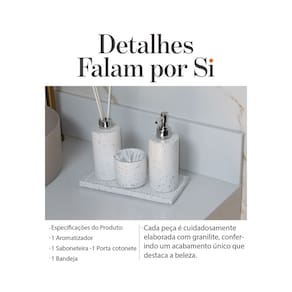 Olá! Seja bem-vindo à Multitudo Casa, sua parceira de confiança há mais de 15 anos. Apresentando o Kit Aromatizador Saboneteira e Porta Cotonetes Modelo Peonia Você merece um toque de elegância e funcionalidade em sua casa, e é exatamente isso que nosso kit oferece. Vamos explorar os detalhes: Saboneteira Artesanal: Feita com carinho e estilo artesanal. Durável e pronta para enfrentar o uso diário. O design elegante combina perfeitamente com qualquer decoração. Aromatizador: Transforme sua casa em um oásis perfumado. O aroma suave e relaxante vai envolver seus sentidos. Sustentável e livre de produtos químicos agressivos. Porta Cotonetes: Organize seus cotonetes com praticidade. O acabamento em granilite adiciona um toque sofisticado. Funcionalidade e beleza em um só produto. Base Retangular: A base perfeita para exibir seu conjunto. Feita de cimento resistente.