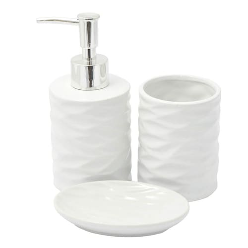 - 1 Porta sabonete líquido: 16 x 7 altura x diâmetro - 1 Porta escova: 9 x 7cm altura x diâmetro - 1 Porta sabonete em barra: 2 x 8,5 x 11cm altura x largura x comprimento