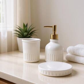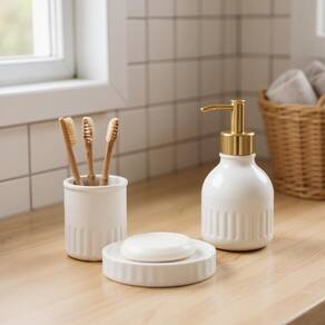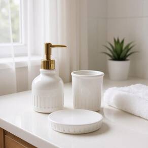 Transforme a organização do seu banheiro com o Kit Banheiro Nirvana. Fabricado em cerâmica de alta qualidade, esse conjunto une estética e funcionalidade para deixar seu espaço mais elegante e prático.