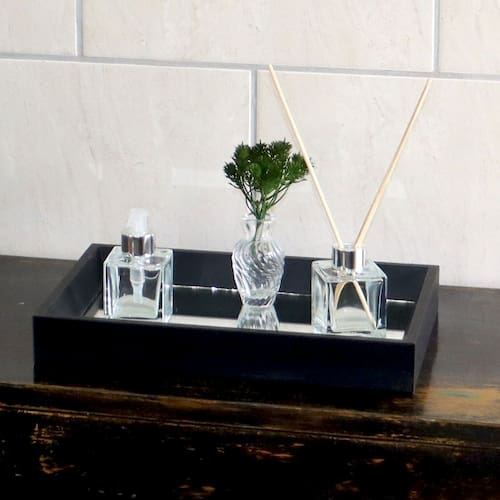 INCLUSO: - 01 Porta Sabonete Líquido 100ml* - 01 Aromatizador 100ml* - 01 Válvula e 01 Tampa para os vidros na cor Prata - 03 Varetas difusoras - 01 Vasinho decorativo + Ramo de folhagem - 01 Bandeja de Espelho Reforçada 23cmx33cm (Escolha a cor nas opções de compra Preta ou Marfim)