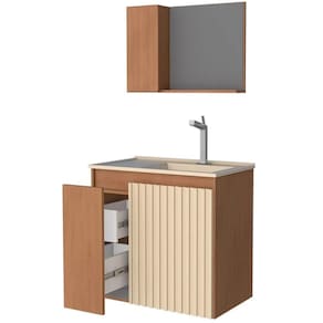 Kit Banheiro Madeira Camomila 60cm Jequitibá - P102882 - Cozimax Kit Banheiro Madeira Camomila 60cm Jequitibá - P102882 - COZIMAX Descrição: O banheiro em madeira Kit Camomila da Cozimax traz a tendência do acabamento ripado para a linha de kits completos. Além da porta ripada, que possui recobrimento para melhor acabamento e durabilidade, ele também conta com prateleira interna, lavatório com opção de cor areia ou branco, gaveta interna com corrediça telescópica e espelheira com armarinho e com Jequitibá.