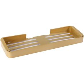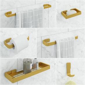 6 peças em aço dourado: Porta toalha (45 cm), porta toalha rosto (22 cm), gancho, saboneteira, porta shampoo e porta papel higiênico.