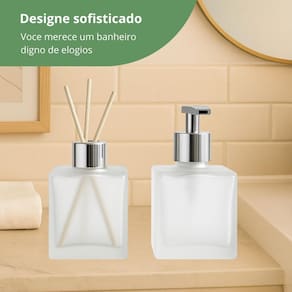 Kit Banheiro - Decoriatto O Kit Banheiro da Decoriatto une sofisticação e praticidade para organizar e decorar banheiros e lavabos. Disponível nas cores branco, preto e âmbar, é perfeito para quem deseja um conjunto funcional e elegante. Composição do kit: 1 Difusor de aromas - frasco de vidro 250 ml com tampa metal luxo prata R28/410 e varetas aromatizadoras 15 cm. 1 Dispenser para sabonete líquido - frasco de vidro 250 ml com válvula Prime prata R28/410. Diferenciais: Disponível nas cores branco, preto e âmbar. Peças também vendidas separadamente. Materiais de alta qualidade e fácil limpeza. Design versátil que harmoniza com diversos estilos de decoração. Ideal para uso próprio ou para presentear. Marca: Não Informado