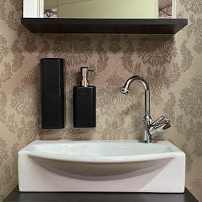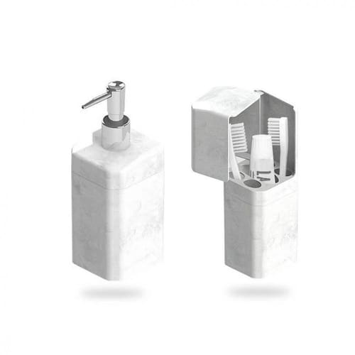 Praticidade e design juntos para deixar seu banheiro organizado e bonito. Porta sabonete líquido e porta escova de dentes com mecanismo de encaixe para pendurar na parede!