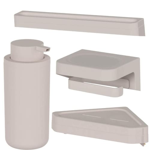 Conteúdo: 1 saboneteira dispenser, 1 porta shampoo cantoneira, 1 toalheiro e 1 porta papel higiênico;