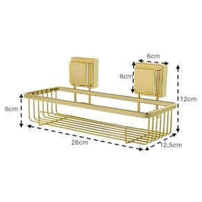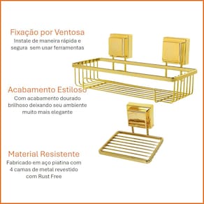 Deixe seu banheiro muito mais organizado e pratico com esse kit, acabamento em dourado brilhoso levando elegância e quialidade para o seu ambiente, fixação por ventosa acaba agilizando a instalação sem precisar furar a parede