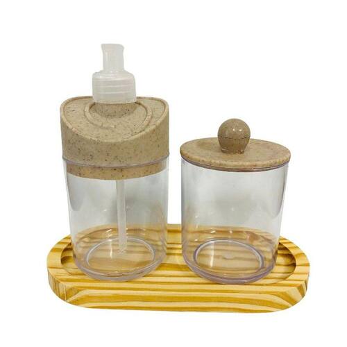 Kit Banheiro de madeira c/ 2 Peças O material é resitente, antibacteriano, sustentável, orgânico e natural, para quem busca por produtos sustentáveis, modernos e elegantes. Acompanha: - 1 Dispenser de Sabonete Líquido - 1 Porta algodão/cotonete Material Utilizado: - Potes e tampas: Plástico - Bandeja: Madeira Medidas: - Sabonete Líquido:12x21 cm - Porta Algodão/Cotonete: 8x13 cm Ean: 7898901267249