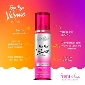 O Bye Bye Volume e No Frizz Liso Mágico 200ml é um spray alinhador dos fios que conta com proteção térmica. É ideal para a finalização de cabelos com excesso de volume e incômodo de frizz, já que forma uma película protetora contra a umidade. Seu previne pontas duplas, nutre, hidrata e proporciona brilho intenso.